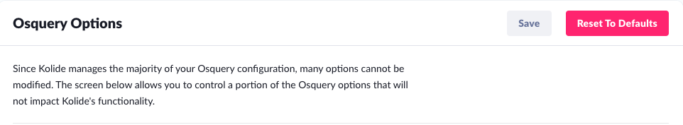 The Osquery Options page allows you to adjust the configuration of the osquery agent. We strongly recommend using the default values, but provide access to these options, for advanced users, who need to fine-tune the behavior of the osquery agent on their devices.