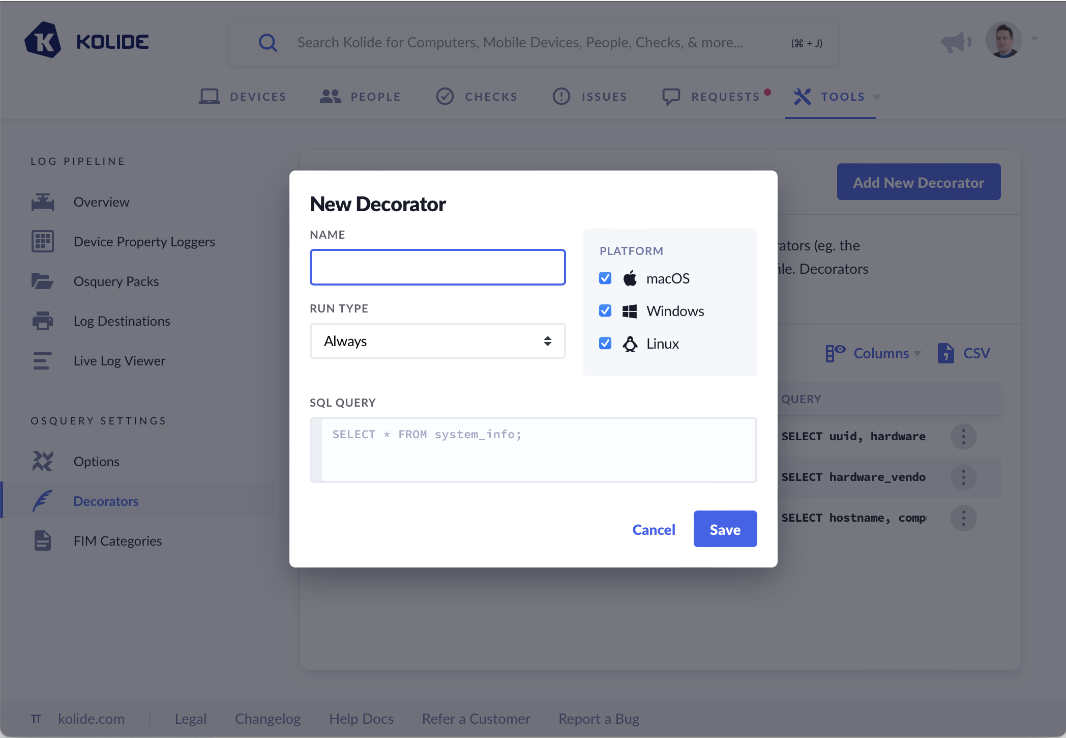 In this section, you can add your own decorators by creating a name, which will be added to results in the log-file, select which OS platform you want to run the decorators on, designate a Run Type, as well as a SQL Query.
