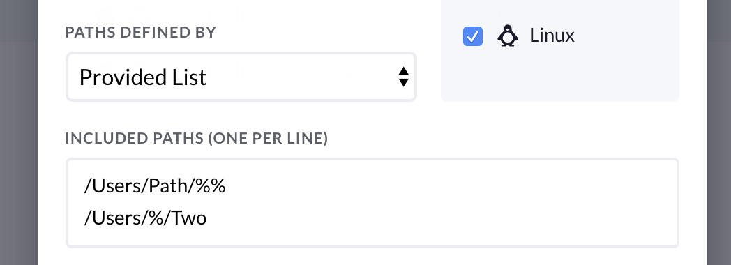 We can use fnmatch-style, or filesystem globbing, patterns to represent the target paths. You may use standard wildcards * or SQL-style wildcards % .