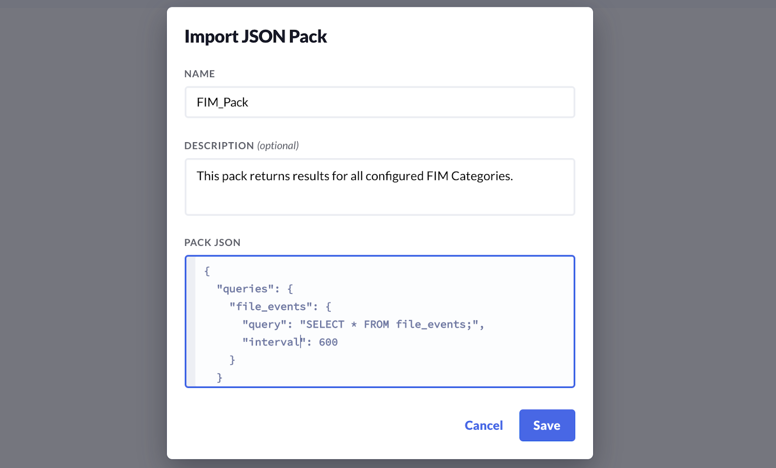 In order to retrieve these events, a Query Pack that queries the file_events table must first be configured. Query Packs are configured in the Logging Pipeline/Query Packs. An example Query Pack for retrieving FIM results could be: