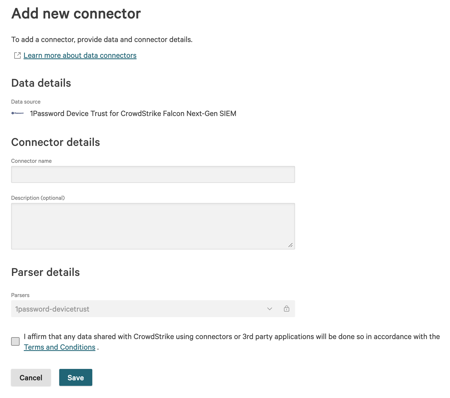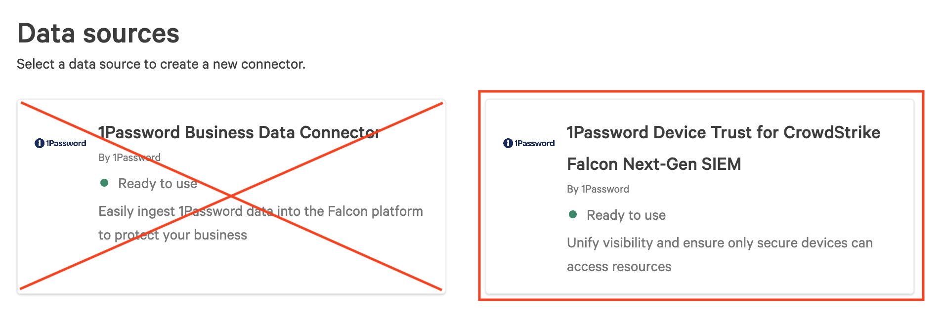 - In the list of data sources, click “1Password Device Trust for CrowdStrike Falcon Next-Gen SIEM”. You may need to search for it in the top right corner.