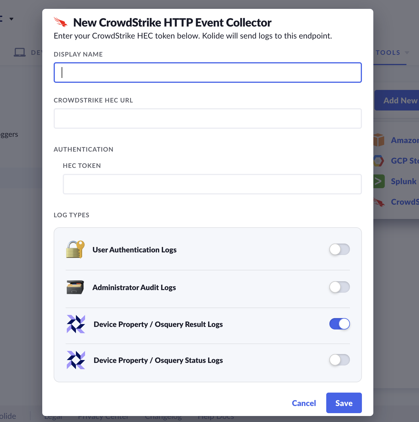 The CrowdStrike HTTP Event Collector(HEC) allows you to easily stream logs from Kolide directly into your CrowdStrike instance in a format suitable for ingestion.