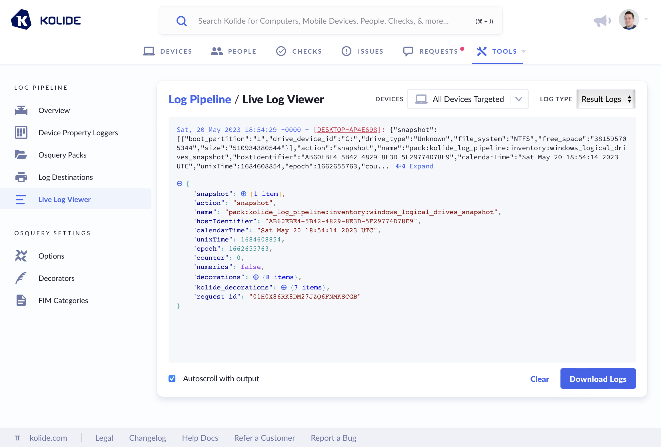 Kolide’s Device Properties and Checks features regularly poll the current state of your devices to provide up-to-date information. For users who wish to forward and store their data outside of Kolide, we offer our Log Pipeline.