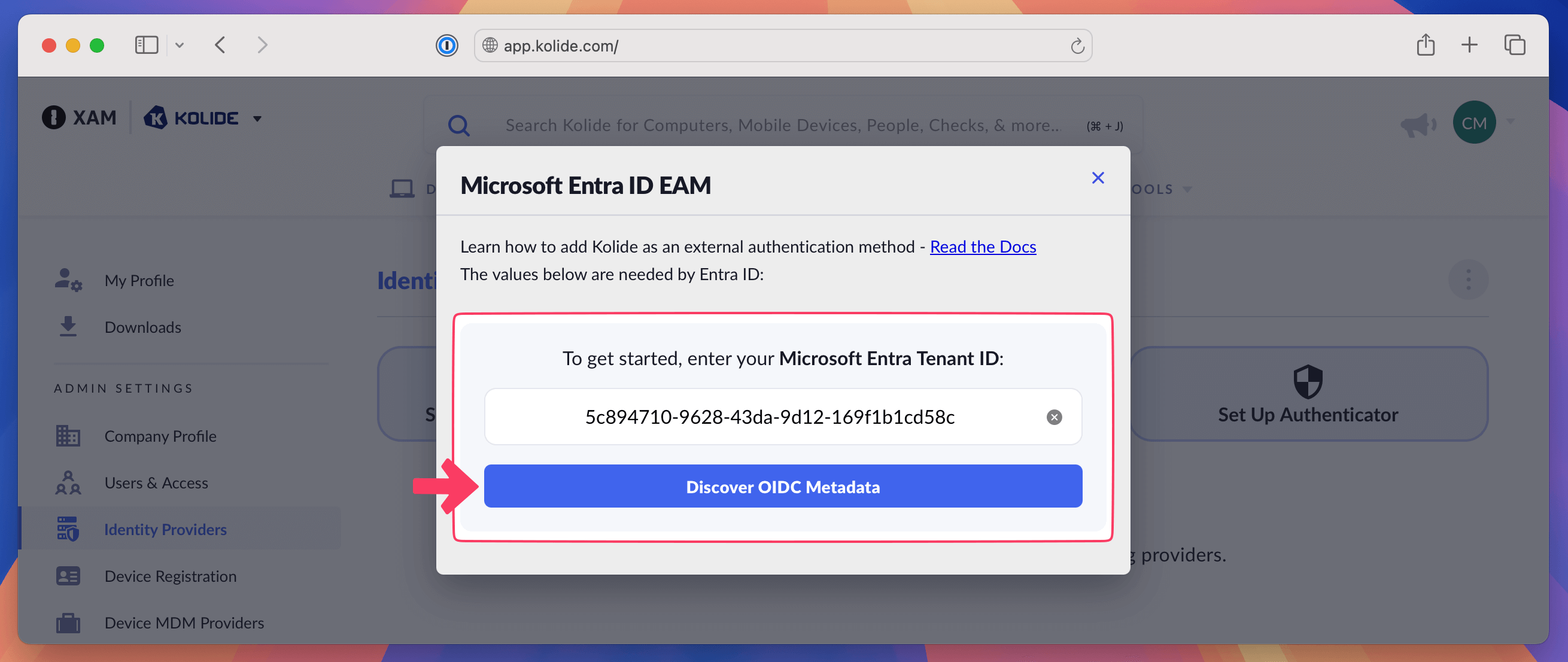 - Paste the Tenant ID you copied in step 2 into the field and select Discover OIDC Metadata. The information will populate into Kolide.