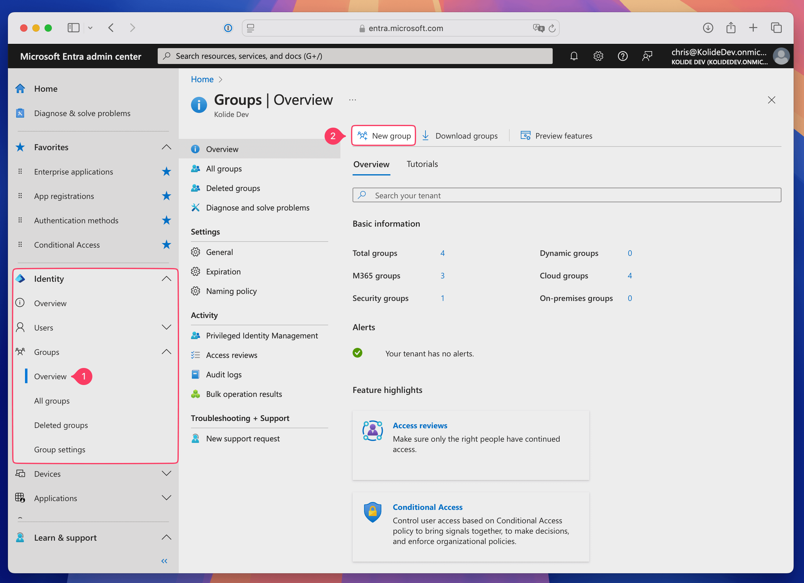 - In Entra ID, select Groups in the sidebar, then select New group.