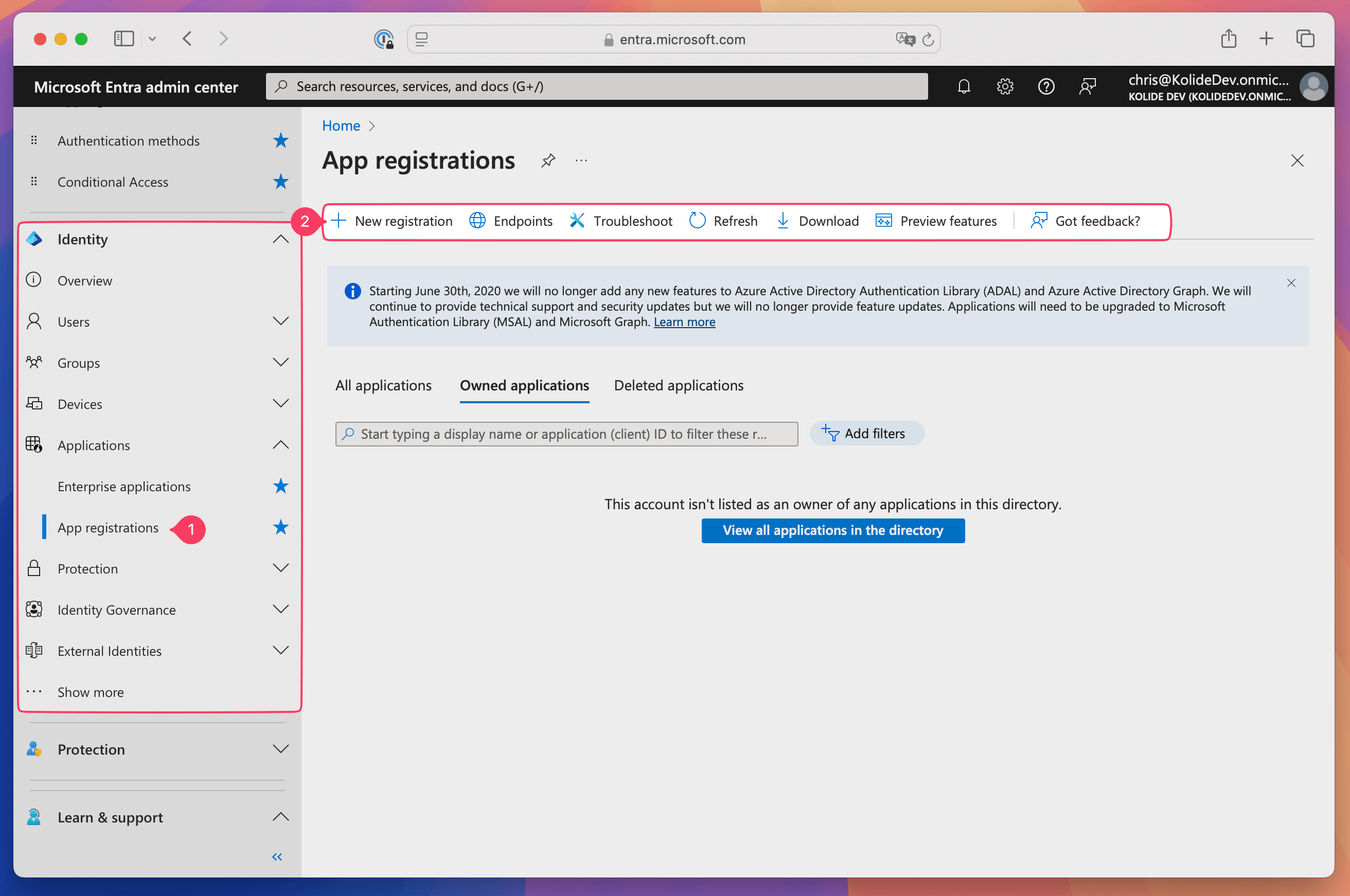 - In Entra ID, select Manage > App registrations in the sidebar.