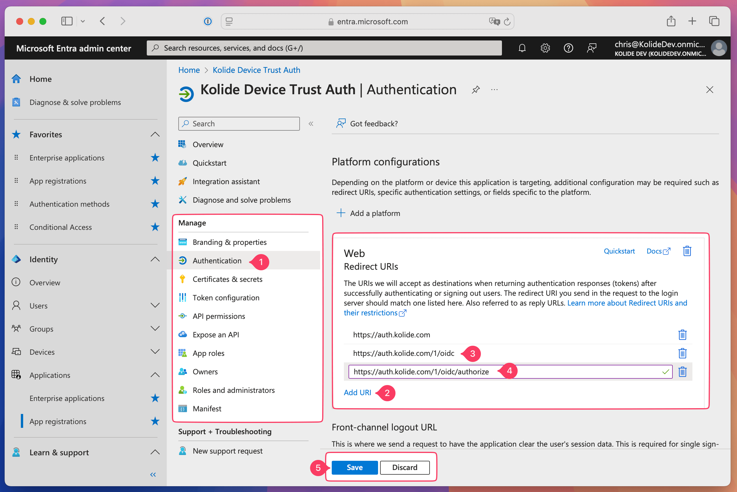 - In Kolide, copy the Kolide Auth URI and paste it into the Redirect URI field in Entra ID.
