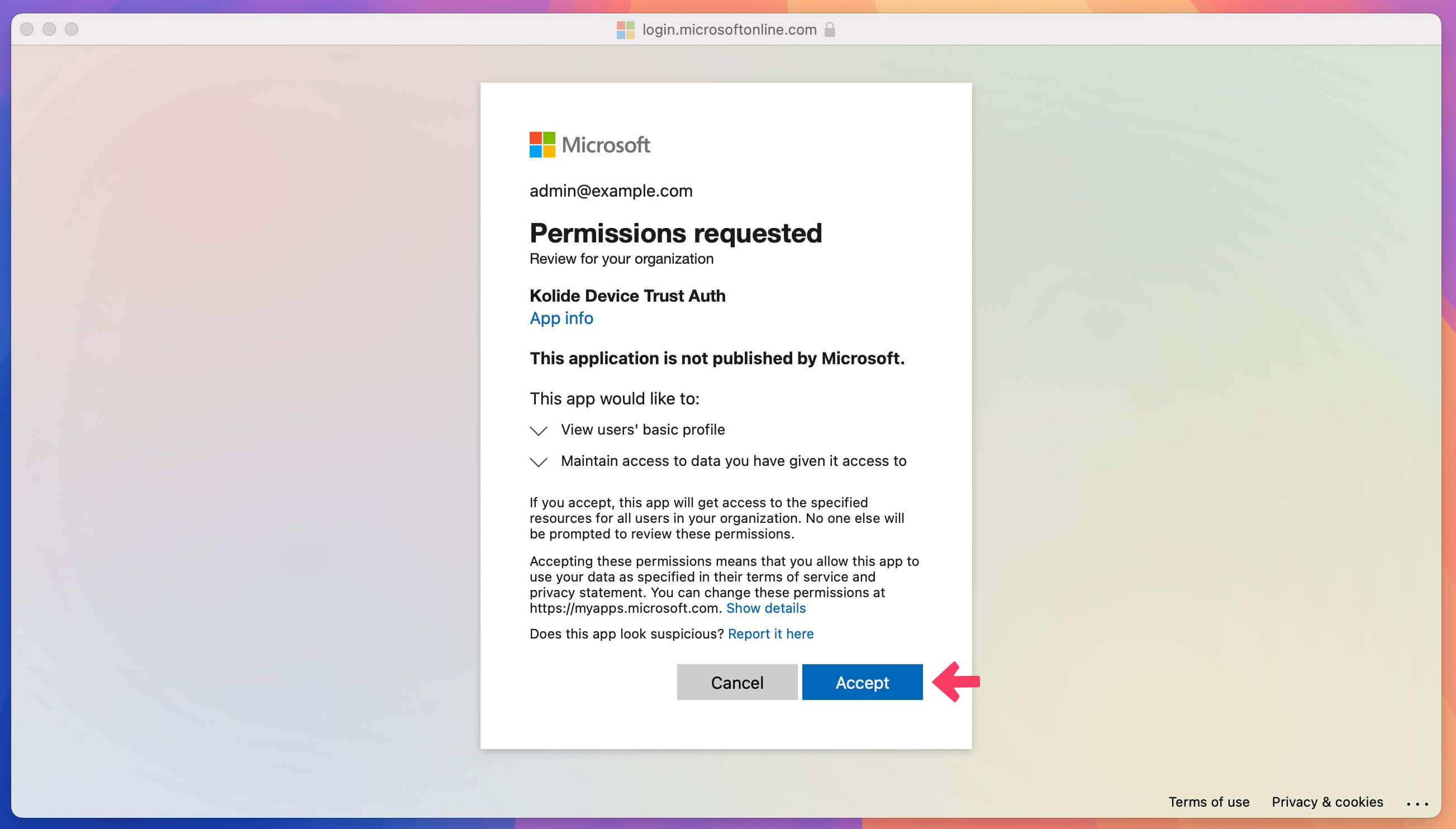 - In a new private browser window, go to https://app.kolide.com, or any other application included in your new Conditional Access policy.