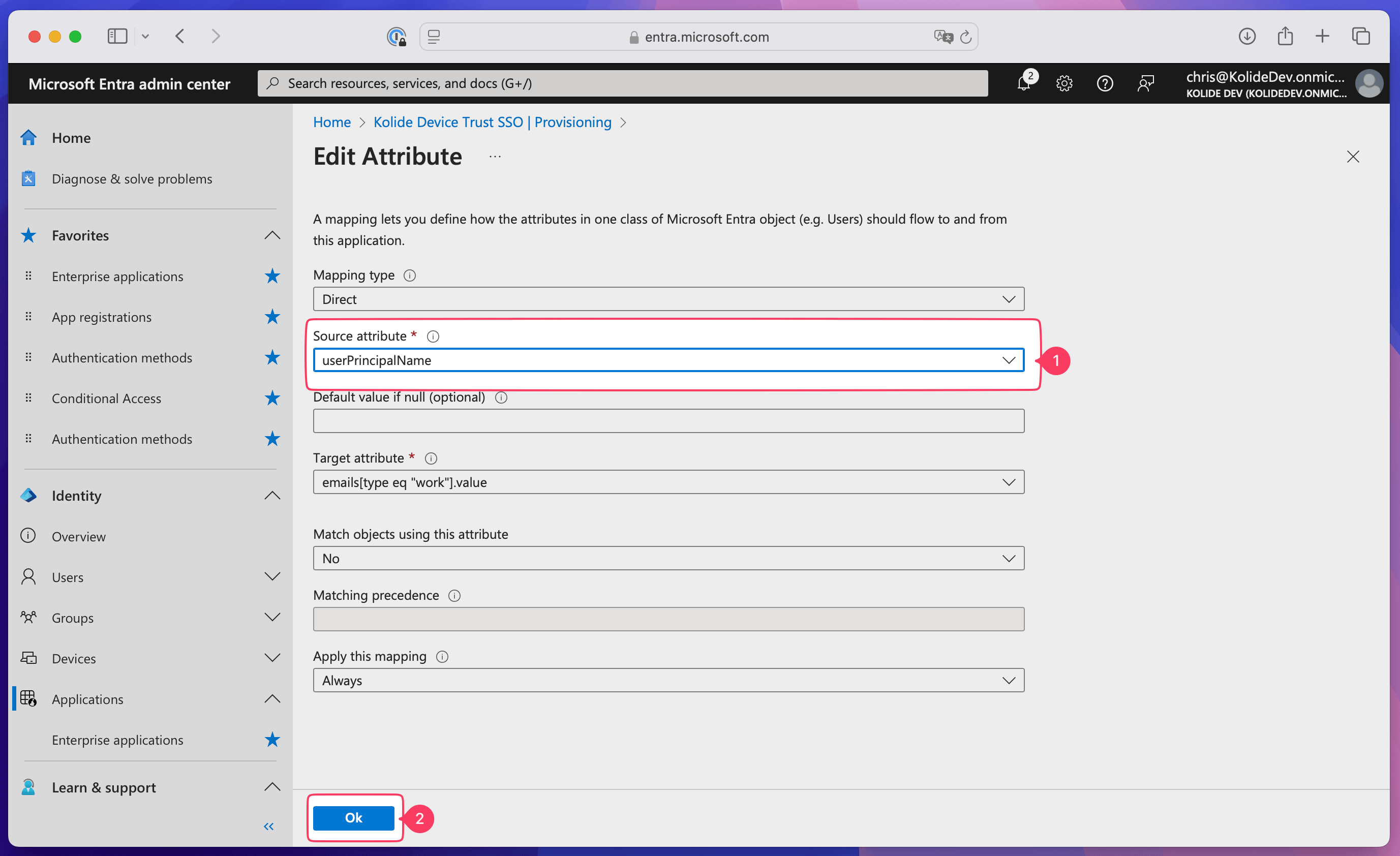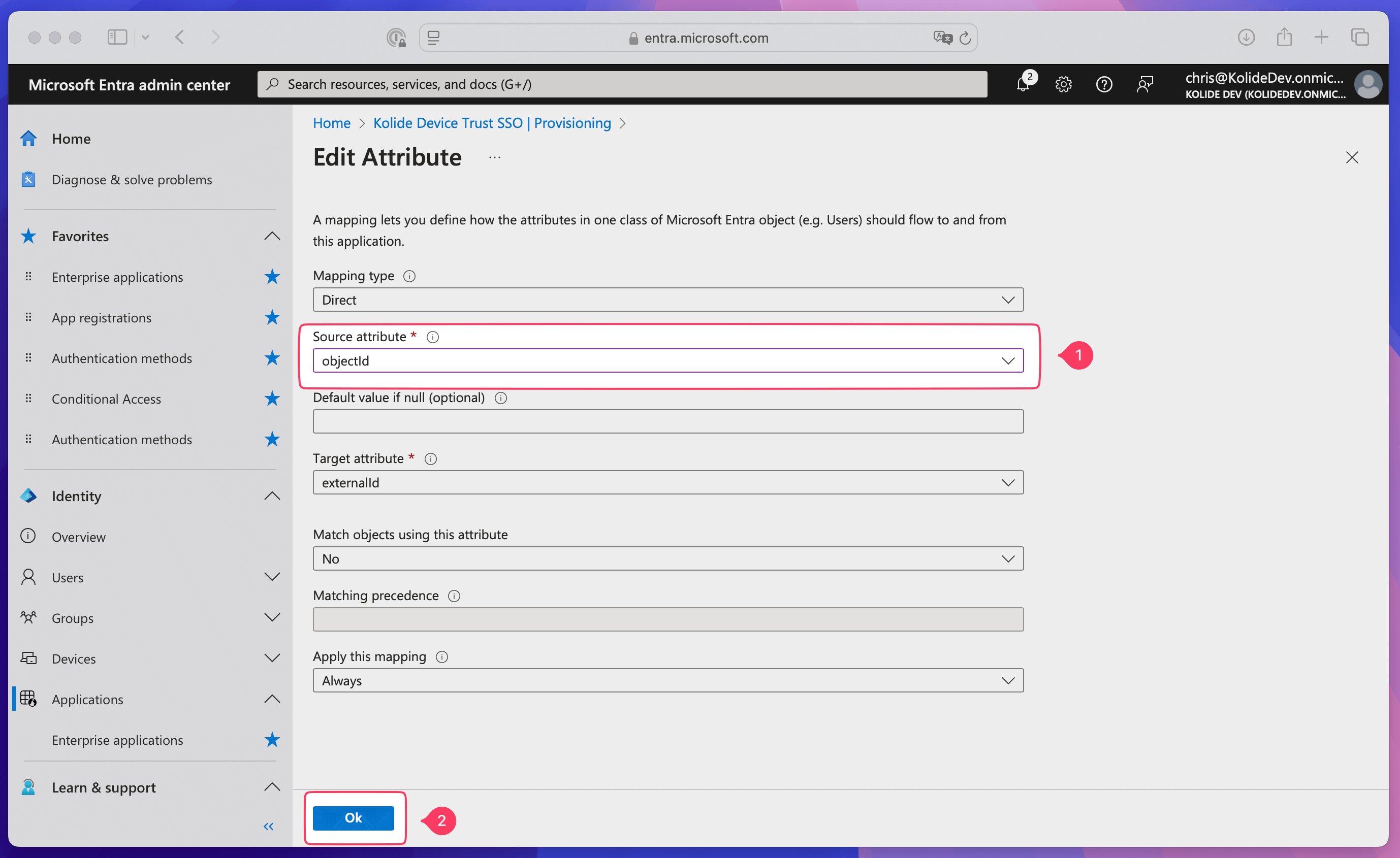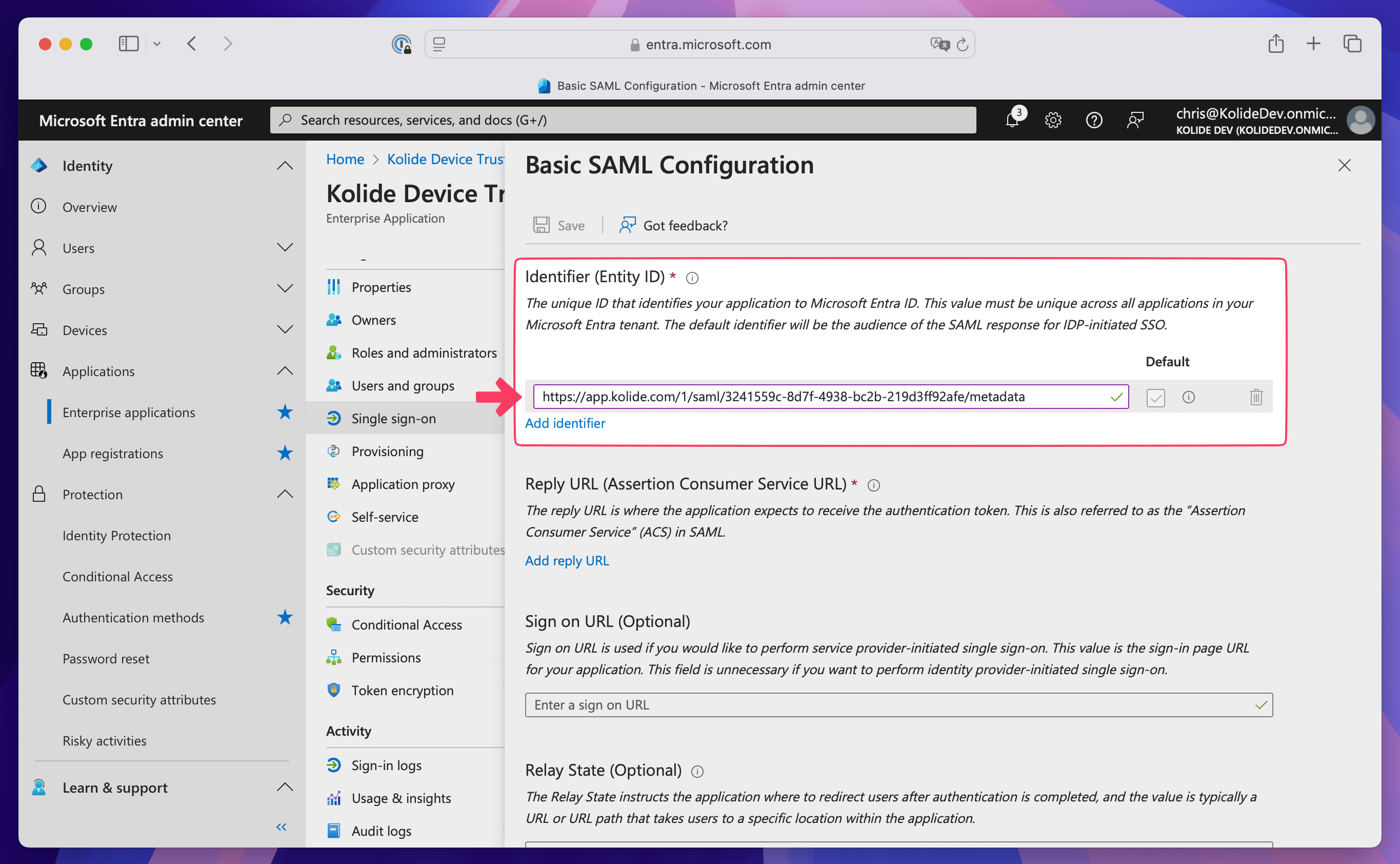 - In Kolide, copy the Kolide Entity ID, then paste it into the Enter an identifier field in Entra ID.