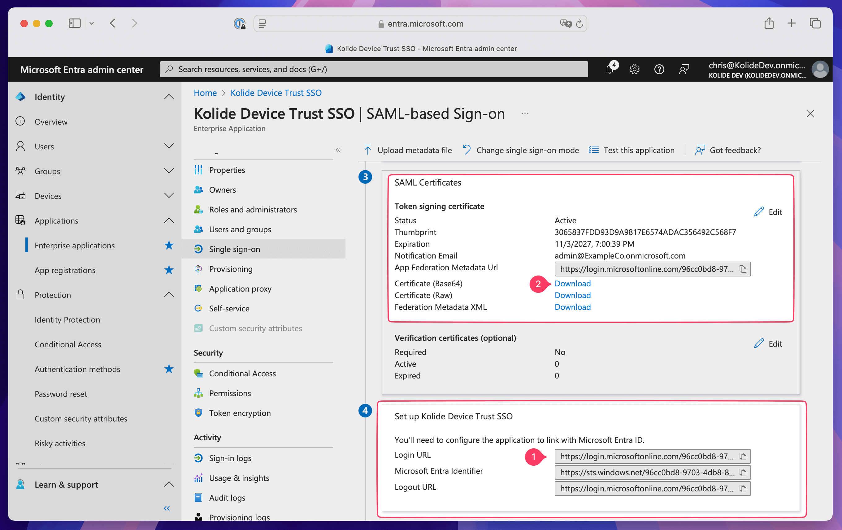 - Choose SAML, then select Download next to Certificate (Base64) in the SAML Certificates box.
