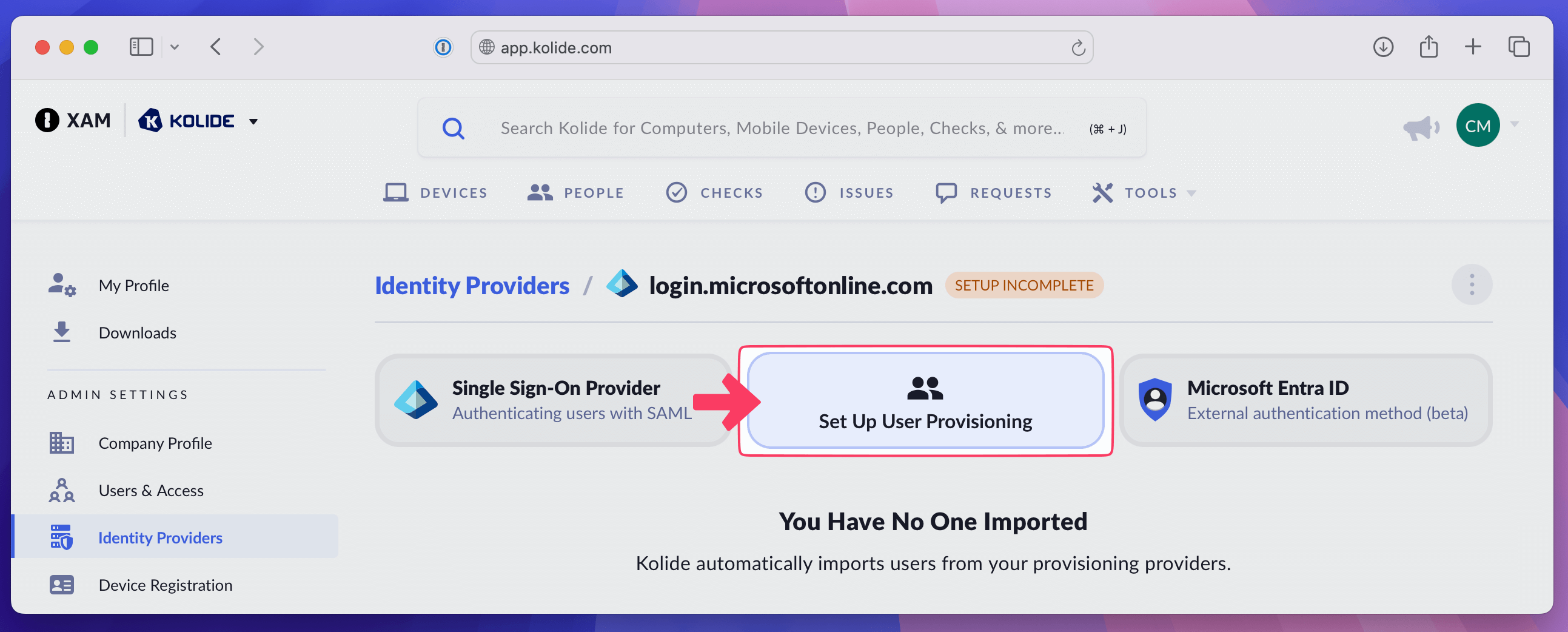 - In Kolide, choose Set Up Single Sign-On Provider.