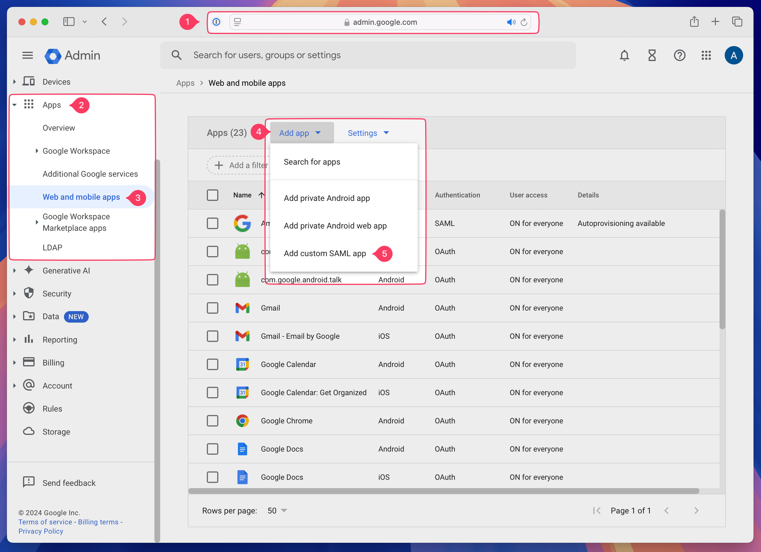 - In the Google Admin console, select Apps > Web and mobile apps.