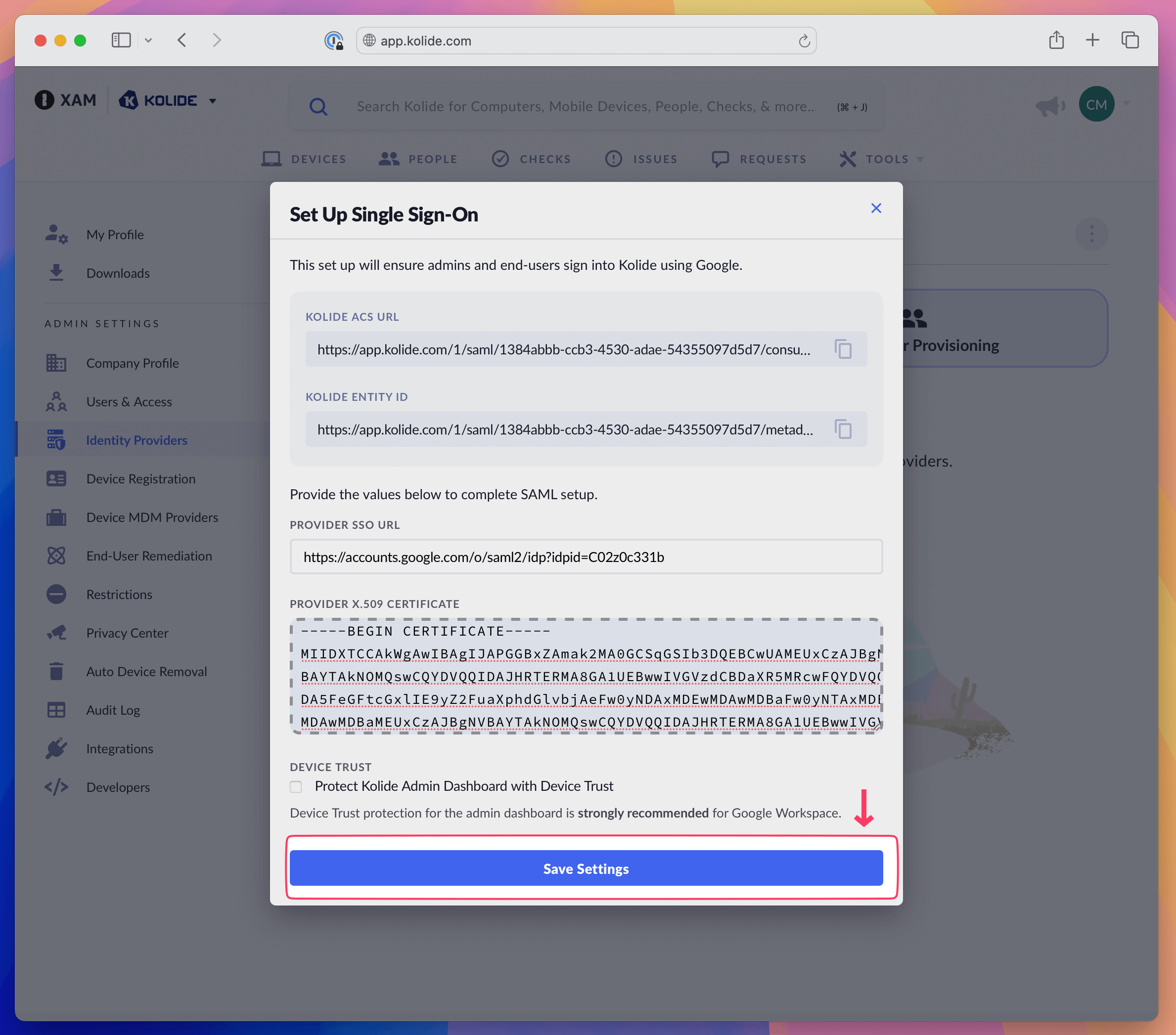 - In Kolide, select Save Settings.