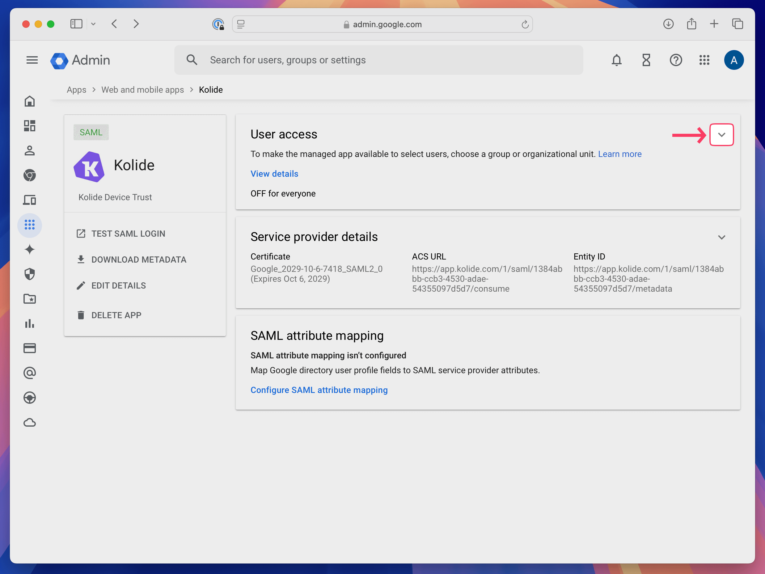 ACS URLfrom your app and paste it into theACS URLfield in Kolide. -