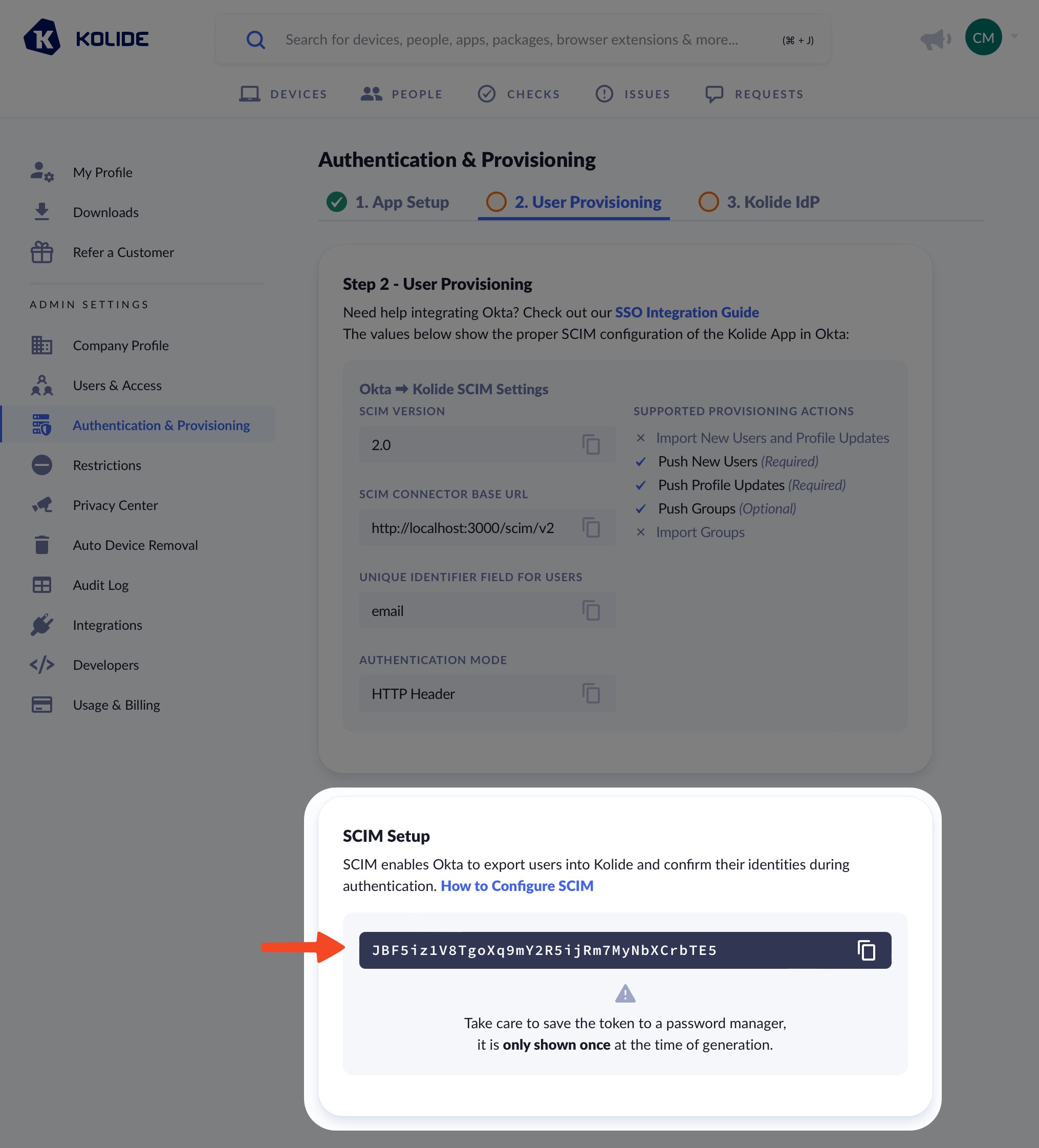 userName,active,givenName,familyName,email, anddisplayName. - In Kolide, select I’ve Saved The Token, Finish Set Up.