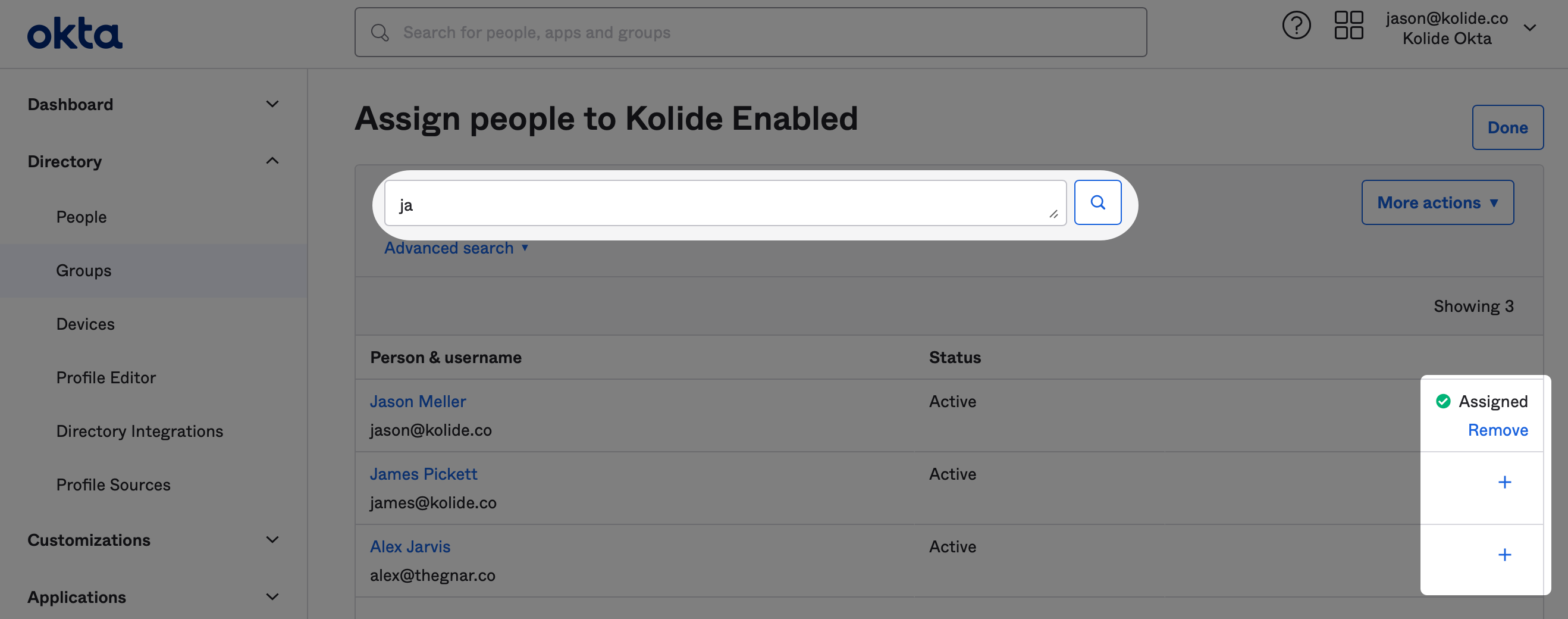 - Select Assign beside the Kolide Enabled group, then select Save and Go Back > Done.