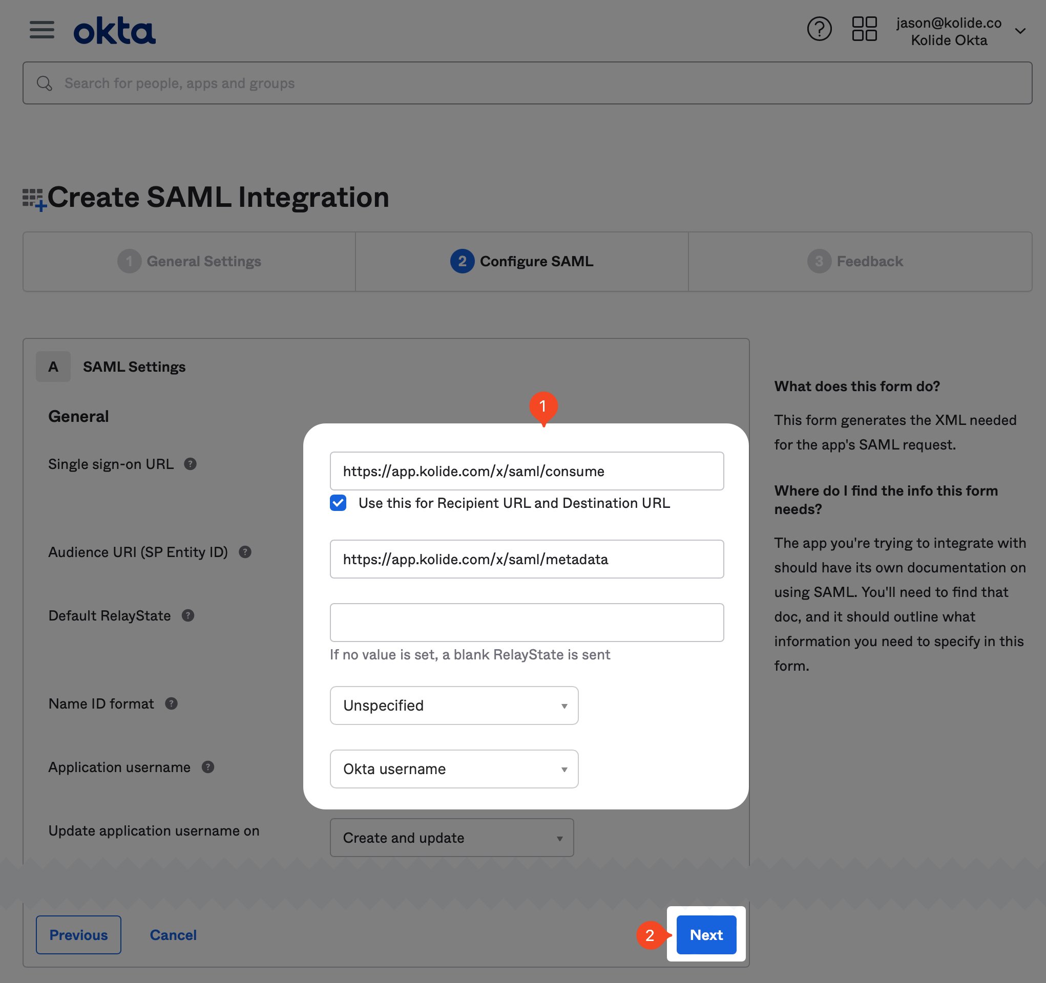 - Copy the Kolide Entity ID value into the Audience URI (SP Entity ID) field in Okta.