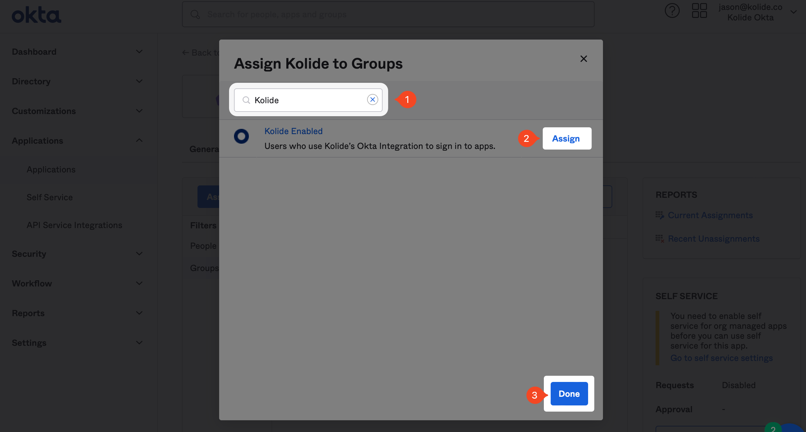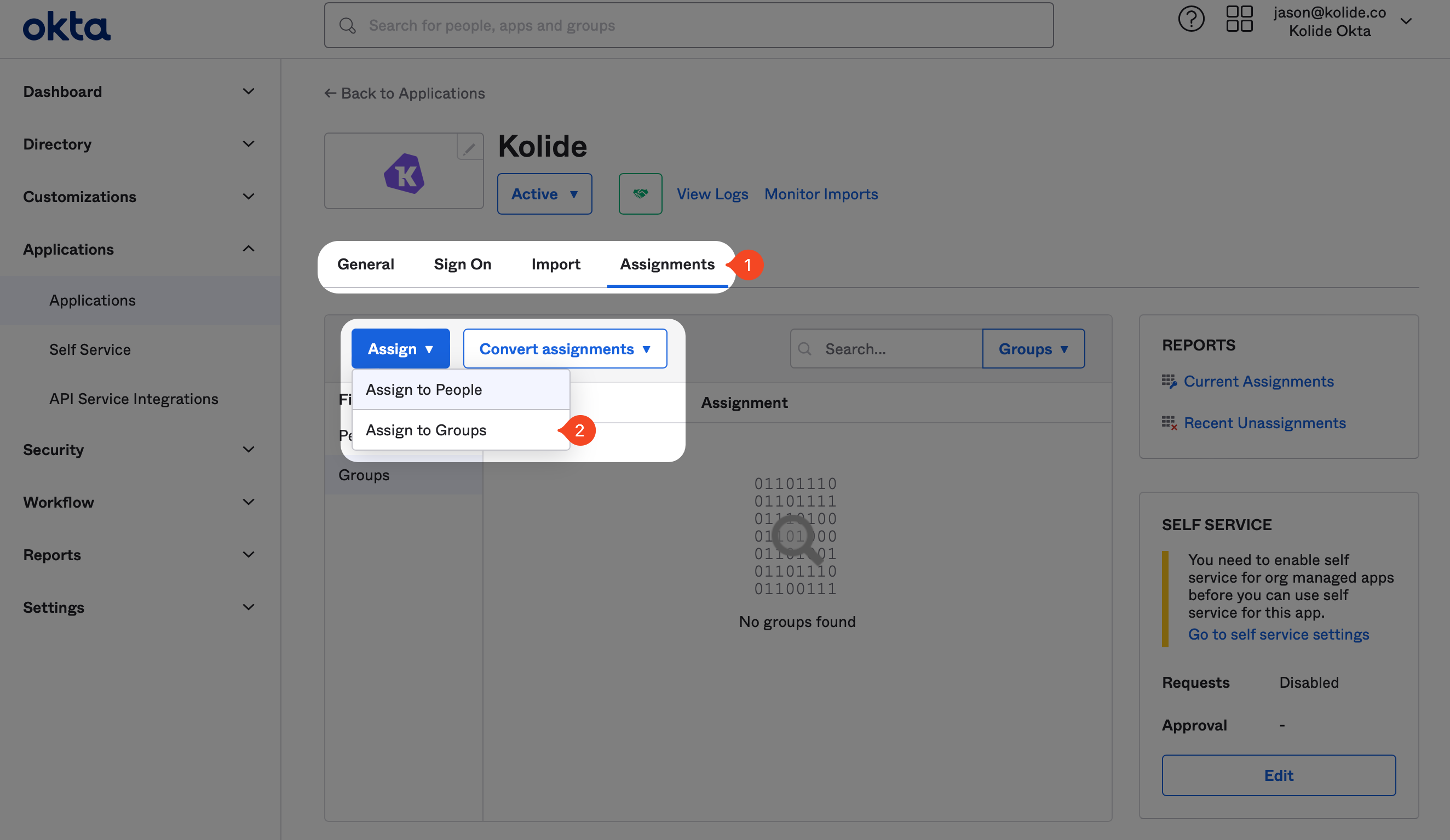 - In Okta, select the Assignments tab, then select Assign > Assign to Groups.