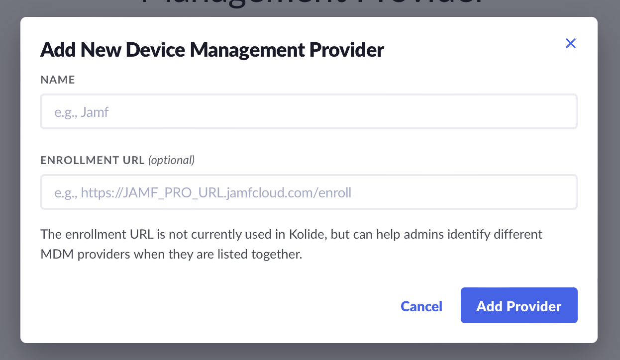 In the modal that appears, add a name for the MDM and (optionally) the Enrollment URL. The name and url help admins differentiate between multiple providers in the settings UI and are not shown to users.