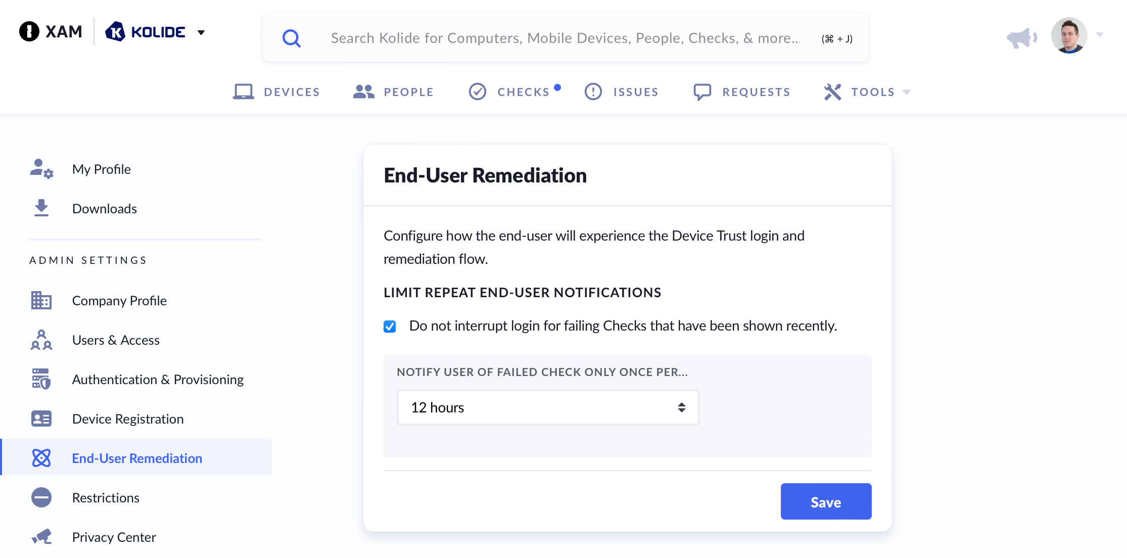 Depending on your SSO’s settings, an end-user may be asked to complete a Kolide Device Trust authentication flow more than once per day. In a situation where their device is failing a check that is currently notifying or warning them, each authentication will be halted so they can acknowledge the issues.
