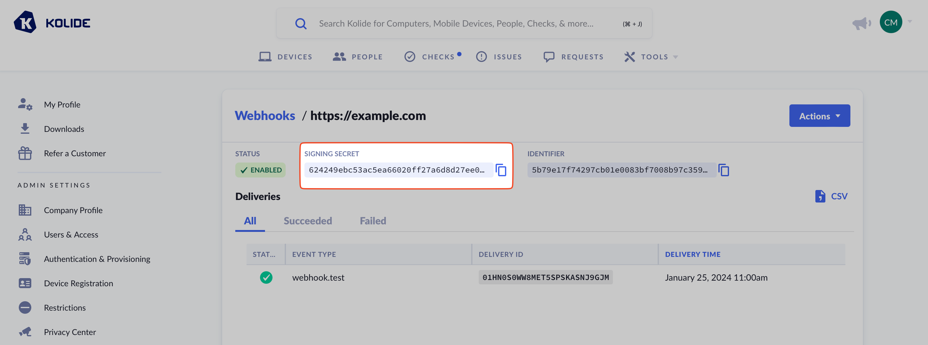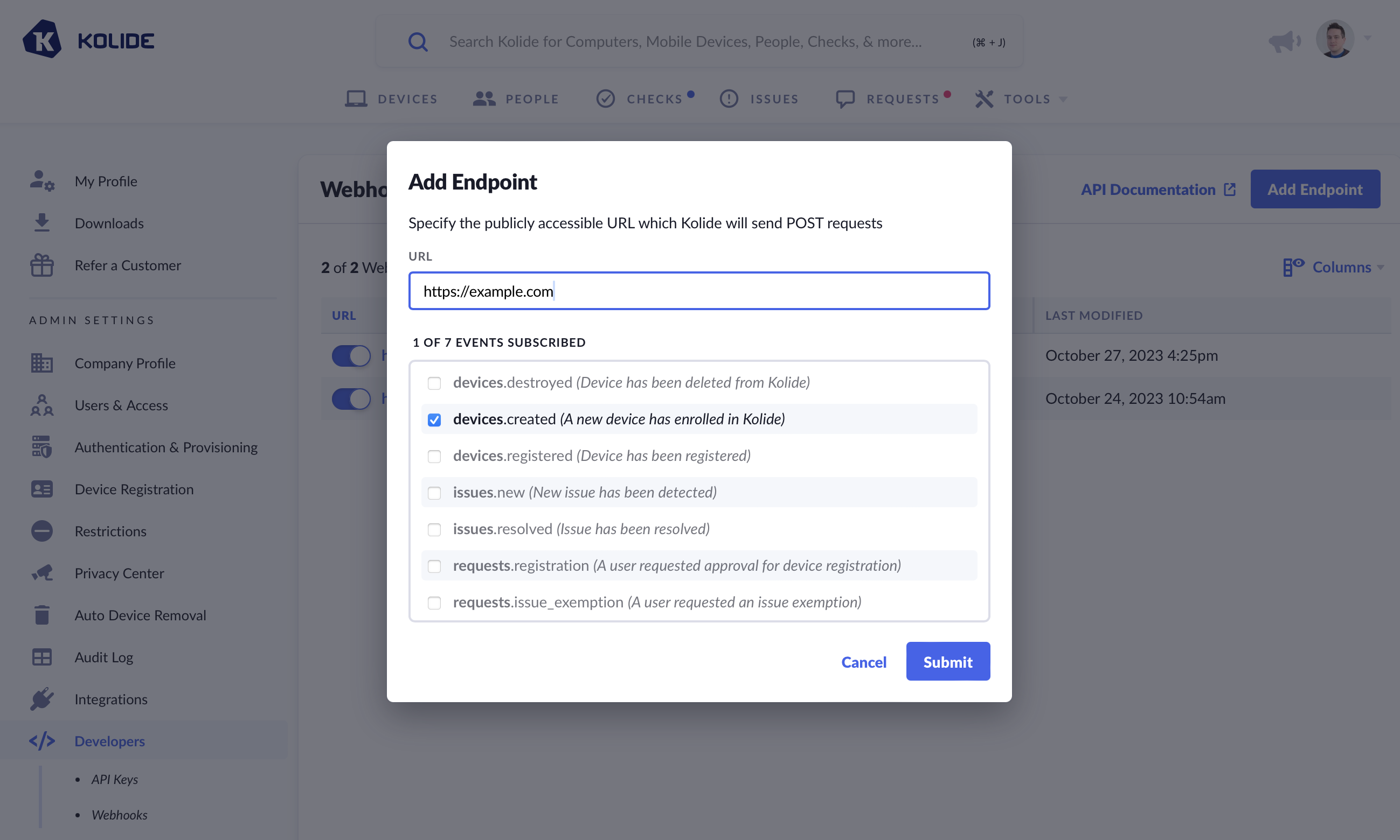 Webhooks are a great way to get notified about important events that occur within Kolide, allowing you to react to them programmatically.