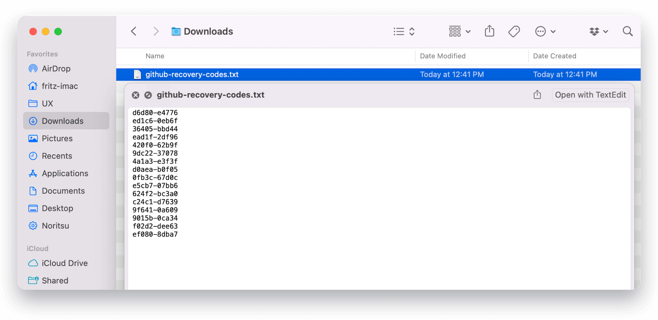 On macOS, one reliable method is to use Spotlight Search to look up files by the URL where the user obtained them. For example, we know that users can download backup codes from the following URLs: